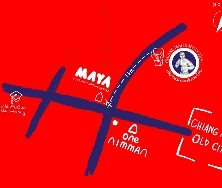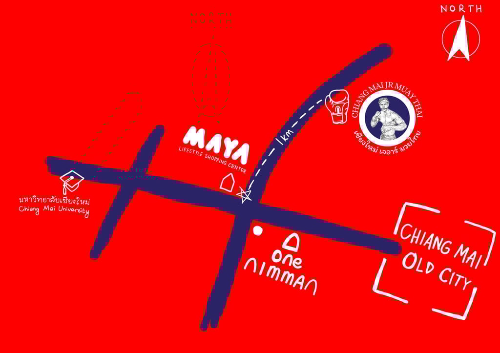 Chiangmai JR Muay Thai Gym is located in the center of Chiang Mai, just one kilometer away from the Maya Shopping Mall and Nimmanhaemin Road. Its prime location offers both convenience and accessibility, making it a perfect spot for locals and visitors alike.
